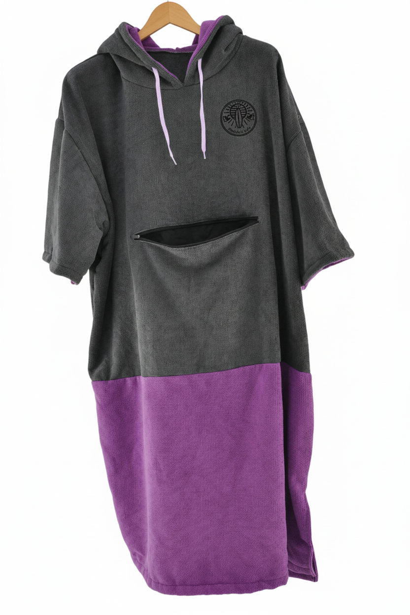 פונצ'ו גלישה יוקרתי בעיצוב שני צבעים. כולל כיס ניילון קדמי מובנה עם זיפר – פתרון אחסון נוח לטלפון ומפתחות. הבד סופג ונעים, והוא הבחירה המושלמת לסטייל ונוחות בים ובבריכה.
